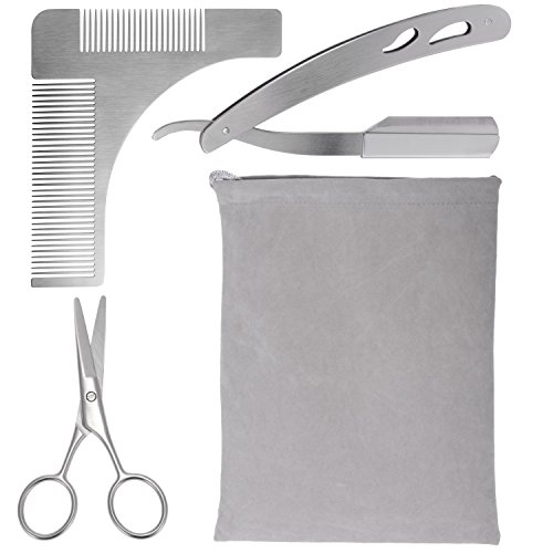 ✅What You Will Get - 1x beard shaping template comb, 1x Straight Edge razor (Blade NOT Included), 1 stainless steel scissors, 1x gray velvet bag. This beard trimming tools are very solid, Recommended to Clean up and Dry this beard Trimming Tools before and after use.