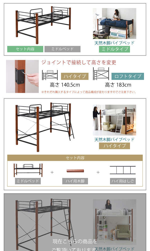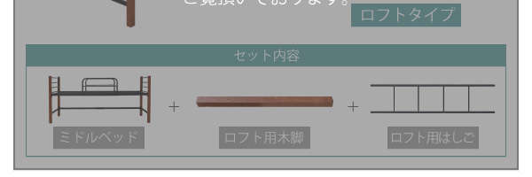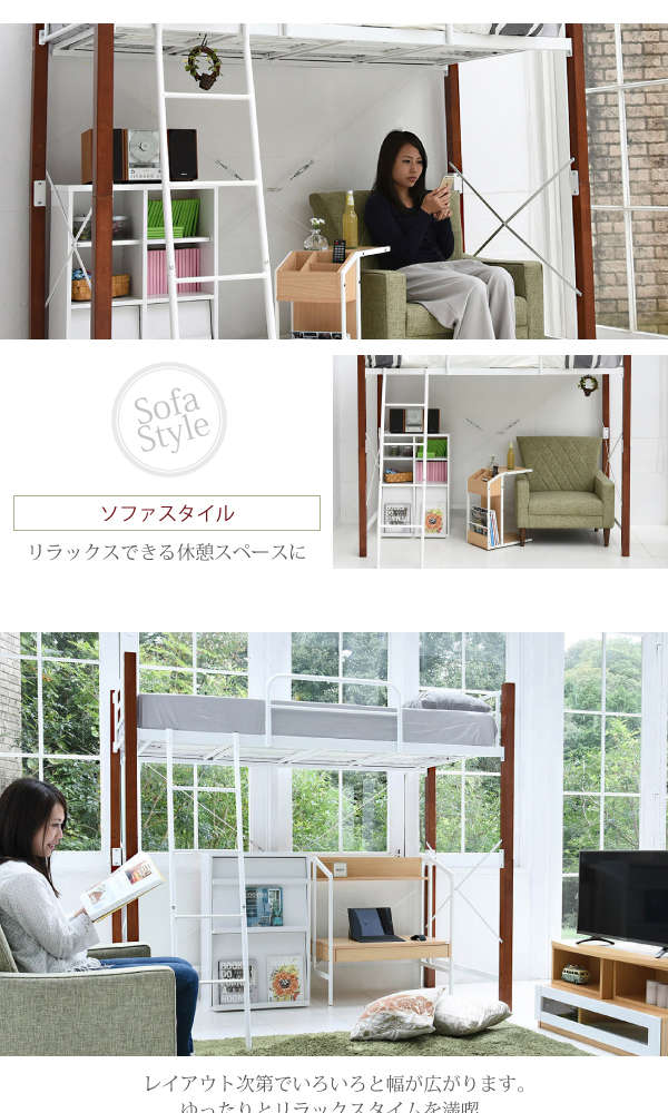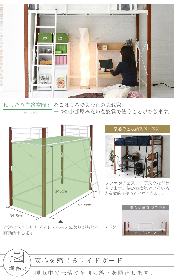 ●高さはロフトタイプなので、ベッドの下には広々としたスペースがあり、チェストやテレビ、デスクを置くことができ1つの空間としてご使用いただけます