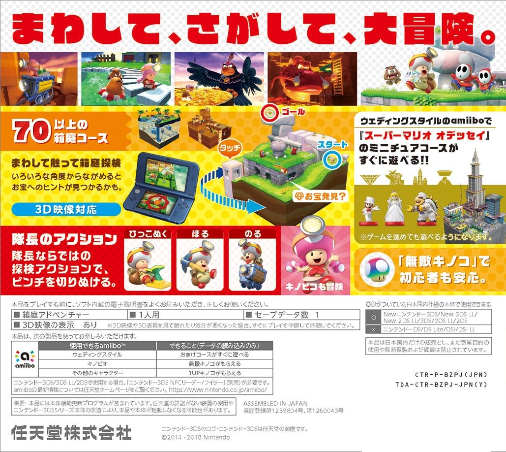 まわして、さがして、大冒険。 Wii Uで発売された箱庭アドベンチャーゲーム『進め!キノピオ隊長』がパワーアップしてニンテンドー3DSソフトとして、新たに登場。 臆病だけど、たまに勇敢なキノピオ隊長が、奪われたパワースターを取り戻すため、冒険の旅に出発します。箱庭コースをぐるぐる見回したり、仕掛けを動かしたりして、ゴールを目指します。 冒険の舞台は、古い遺跡やマグマがふきだす火山、オバケ屋敷など、70以上の箱庭コースに加え、今作には、都市の国「ニュードンク・シティ」など、『スーパーマリオ オデッセイ』のミニチュアコースも新たに収録。 ニンテンドー3DS版では、タッチ操作や、立体視にも対応しており、まるで手元に箱庭があるかのような感覚で楽しむことができます。