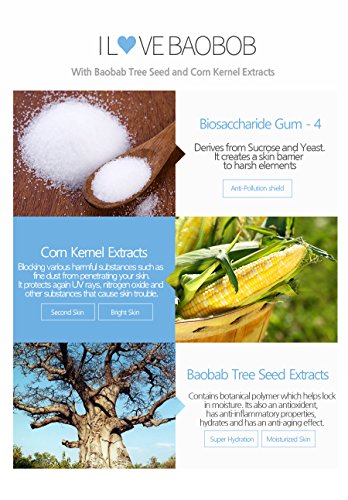 Excellent ingredient extracted from baobab tree seed as natural moisturizer & corn kernel as anti-pollution shield and biosacharide Gum to compose skin barrier