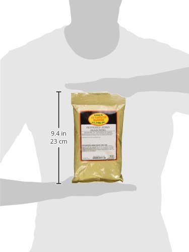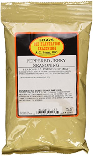 -. Binding : Misc. -. Brand : Old Plantation -. EAN : 0078665001335 -. Feature : A popular blend with just the right amount of black pepper. / 13.5 oz. bags. Each Bag will season 25 lbs. of Jerky Meat. 1 oz. Seasons 1.85 lbs. of Meat.(2 Tablespoons = 1 ounce.) Contains Soy. NO MSG! -. IsAdultProduct : 0 -. Label : AC Legg -. Manufacturer : AC Legg -. ProductGroup : Grocery -. ProductTypeName : GROCERY -. Publisher : AC Legg -. Size : 400 Ounces -. Studio : AC Legg -. Title : AC Legg Peppered Jerky Seasoning -. UPC : 078665001335