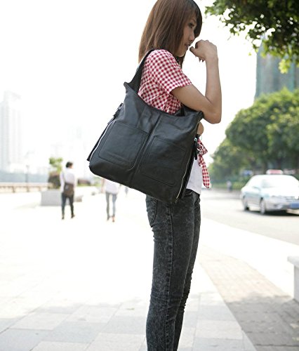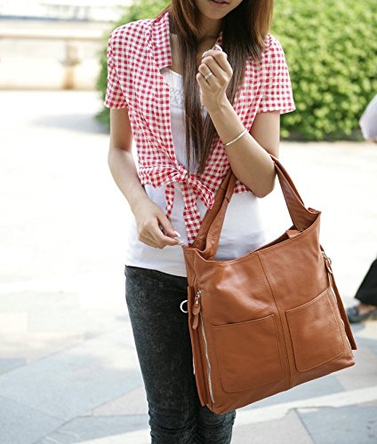 -. Feature : Quality Genuine Leather with a back zipped pocket and 2 front open pockets for small items,detailed quality brown fabric lining.It's gorgeous,which is never out of fashion. / Contains 2 generous main pockets, 1 inner zipper pocket, 1 invisible zippered pocket inside.1 cell phone pocket and 1 ID slot.3 zippered pocket outside the purse. 2 pocket in front of the purse.Easily hold your IPAD AIR / IPHONE / /A4 file and other daily things. / Leather shoulder handle (7.8" in) and removable and adjustable long shoulder strap(length up to 47.2"), you can have 3 carrying options (Single shoulder handbag, cross body and hand carry). / A main compartments was divided by a center zippered pocket and has a zipper pocket for license and 2 open slots for cellphone or cards. / Dimensions: 13.18"L x 2"W x 14.76"H (fit IPAD AIR). The weight is 2.05 pounds
