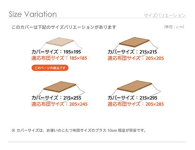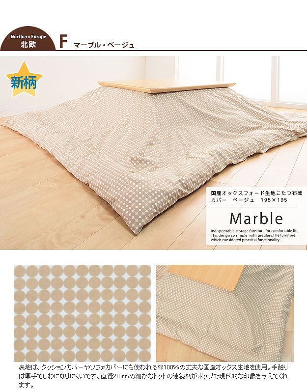 ●商品について:しわがつきにくく丈夫なオックス生地を使用した日本製のこたつ布団カバー。10パターンのカバーをご用意してますので、お好みを選んで模様替えのアイテムに、こたつ布団のリフレッシュにどうぞ♪ファスナーはカバーの中央についており着脱しやすくなっています。洗濯機丸洗いOKでいつでも清潔にお使いいただけます。四隅に布団とカバーのズレ防止用の留め紐付きです。