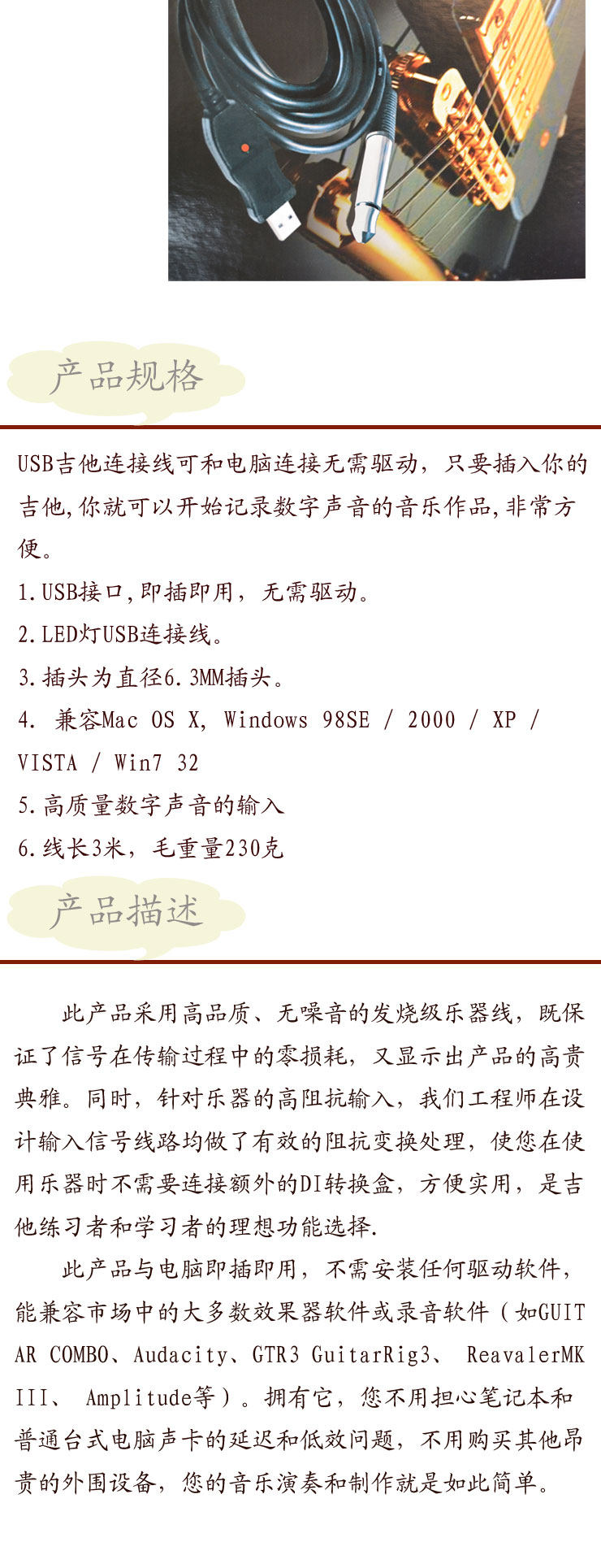 In software, this product is plug-and-play with the computer without the need for any driver software, support for lower delay ASIO drivers, and compatible with most of the effects software or recording software in the market (eg GUITAR COMBO, Audacity, GTR3 GuitarRig3 , ReavalerMKIII, Amplitude, etc.). Have it, you do not have to worry about the delay and inefficiency of notebook and ordinary desktop sound card, do not have to buy other expensive peripherals, your music playing and making is so simple.