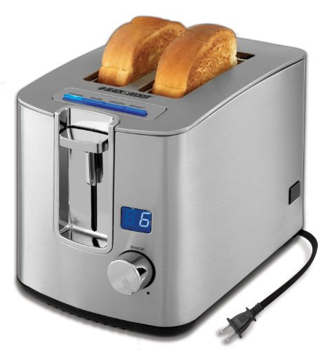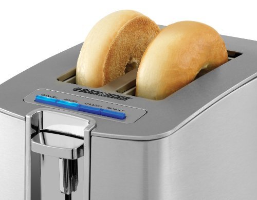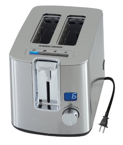 The BLACK+DECKER 2-Slice Toaster is an attractive addition to any kitchen. The LED display and blue backlights add a modern touch to the classic stainless steel look. Find the best results with the shade selection knob and the bagel, frozen, and reheat functions. The toaster has extra-wide slots with self-adjusting guides, plus extra lift to keep your toasted treats in reach. Storage is simplified with a one-touch retractable cord.