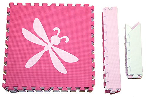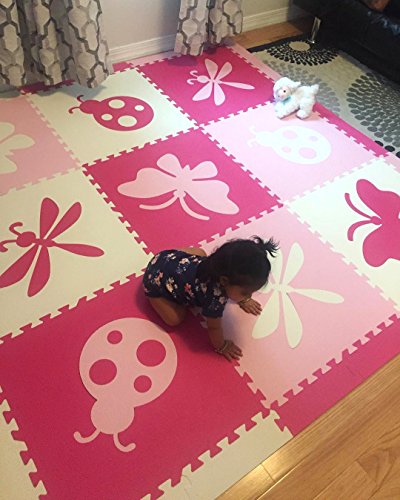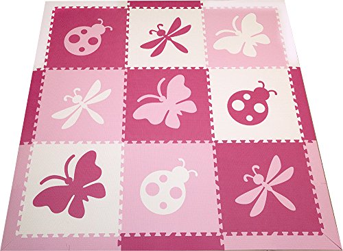 Studio : SoftTiles Publisher : SoftTiles Binding : Kitchen Product Description Create a beautiful children's playroom floor using SoftTiles Bugs Interlocking Foam Play Mats. Three fun shapes- Butterfly, Ladybug, and Dragonfly are die-cut form our large SoftTiles 2 foot x 2 foot foam mats. The Bug shapes in this play mat are very large. They are die-cut from our large SoftTiles 2 foot x 2 foot interlocking foam tiles. This play mat measures 6.5 x 6.5 feet (78 x 78 inches)- an area over 42 sqft. This is a nice sized play area for infants learning to crawl and toddlers starting to walk. This set consists of 9 Die-Cut Shaped Mats (3 Butterfly, 3 Ladybugs, and 3 Dragonflies in Pink, White, and Light Pink with 24 sloped border pieces The sloped borders are unique to SoftTiles and help provide a smooth transition from the mat to the floor. It helps prevent tripping and looks great at the same time. This set does not contain small pieces! SoftTiles are made in Taiwan from EVA foam and tested free of formamides, BPA, phthalates. Because the Bugs foam play mats are die-cut, we do not recommend them for use on soft surfaces like carpet as the pieces can pop up when walked on. SoftTiles has been creating designer foam mats for kids since 1994. We saw the need for great designs and fun colors. If you want a distinctive play mat for your child's playroom, then this mat is for you! If you need a larger mat, combine two of these sets or add a set from our other SoftTiles designs that are available on Amazon: Nautical Theme, Dinosaurs, Flowers, Butterflies, Circles, Squares,Transportation and Safari Animals. 0