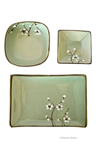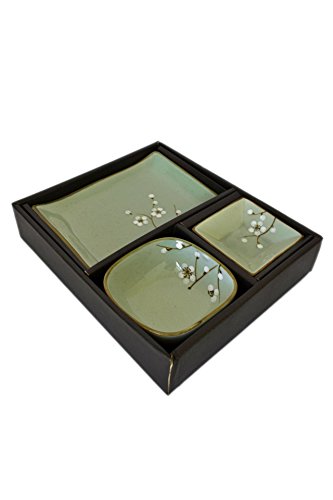Product Description3 PC Sushi Set; Japanese Cherry Blossom Design; Includes: 1 Sushi Plate (6 3/4"L x 4"W), 1 Rice Bowl (4"W x 4"L x 1 1/2"H) and 1 Soy Sauce Bowl (1"H x 3"W x 3"L); Ceramic Construction; Giftbox0