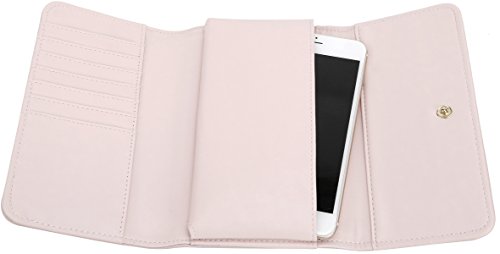Lily Jane's Clutch Wallet Purse has a removable chain strap (26 inch drop) with a soft vegan leather strap area for where it rests on your shoulder. The clutch has a compartment for even plus sized phones. In addition to the compartment that can fit upto an iPhone Plus or Galaxy Note, there's a cash compartment and 7 card slots. Made of synthetic leather & gold metal tone hardware, the clutch has a button clasp to keep your contents secure.Feature