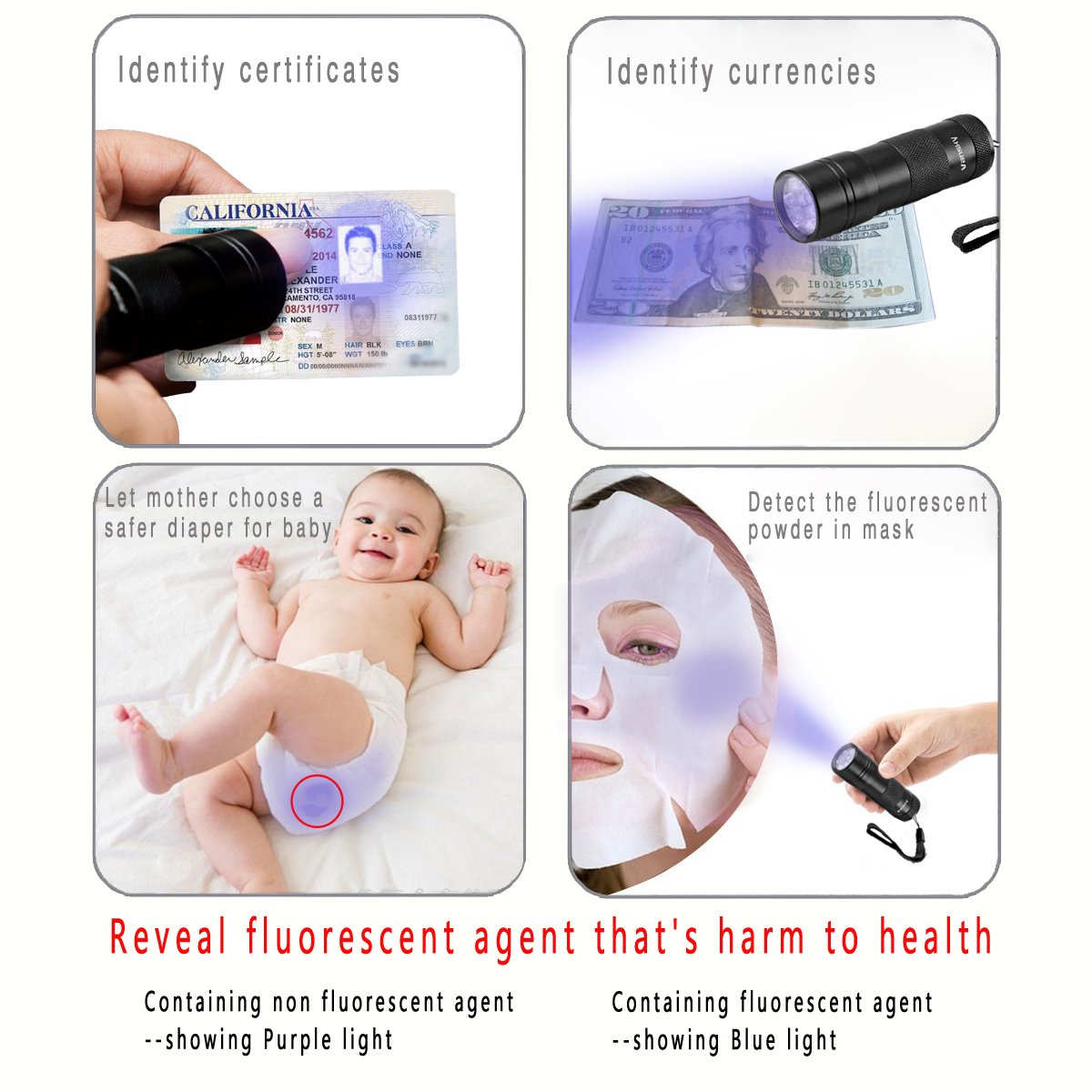 Please note that this product is not very bright as a normal LED flashlight with ultraviolet light.