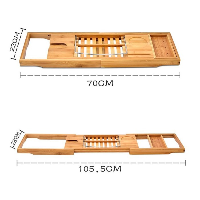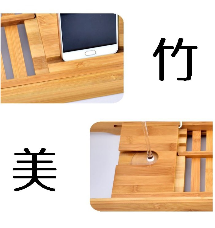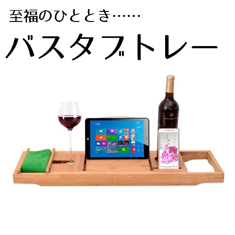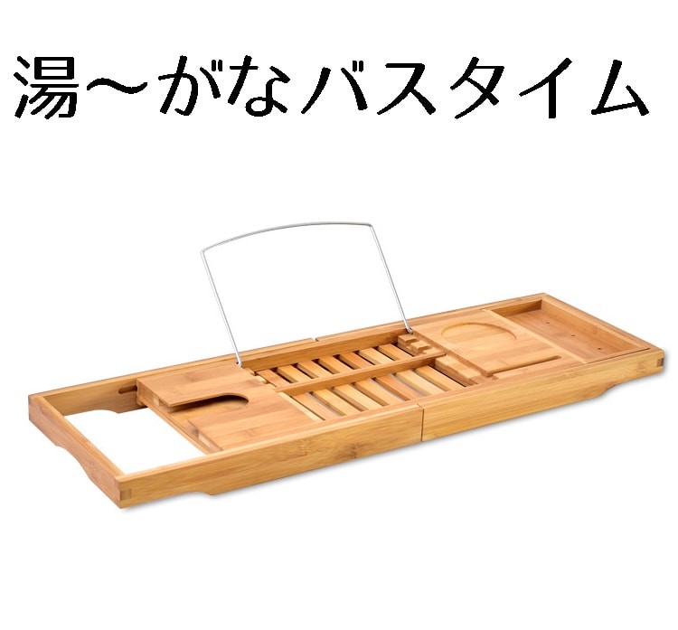 お風呂でゆっくりお風呂に浸かりながら、雑誌や小説を読んだり、お風呂で音楽・映画鑑賞、ジュースや本を持ってのんびりと入浴。 半身浴をしながら雑誌などを持ち込んで読書などができます。 浴槽の幅に合わせて伸縮でき、最大約105cmまでのバスタブに掛けられます。 防水のタブレットやテレビを置けます。 ワイングラスを収納できるグラス投入口が付いているので、ジュース等をしっかり置けます。 [サイズ]約70cm-105.5cm x 22cm x 4cm [材質]竹 [生産国]中国 ※使い始めは臭いがする場合がありますが、使っていくうちにとれていきます。 ※本製品を使用しての故障や事故などについてはいかなる保証も致しかねます。十分ご注意の上ご使用ください。