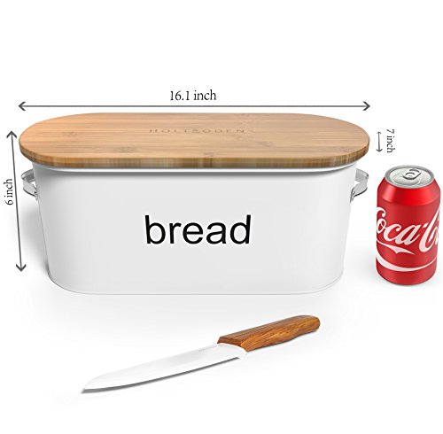 ✔️ ECO FRIENDLY MATERIALS - Bread box lid is made with pure bamboo, while the container is made of galvanized steel. Our knife is made of pure ceramic with an beautifully designed bamboo ergonomic handle.