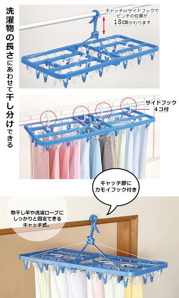 洗濯物がたっぷり干せるピンチ60個付大型タイプ。洗濯物に跡が残りにくい細かな凸面構造のピンチを使用。傷んだら、お手持ちのピンチと簡単に交換できます。竿の高さや洗濯物の長さに合わせて、キャッチとフックを使い分けできます。 |