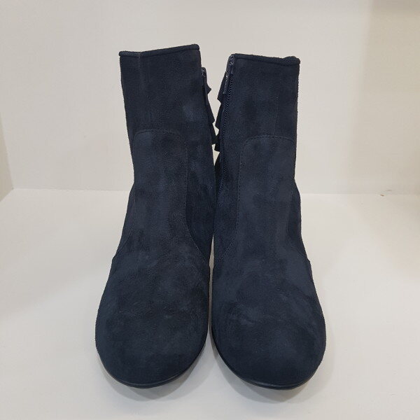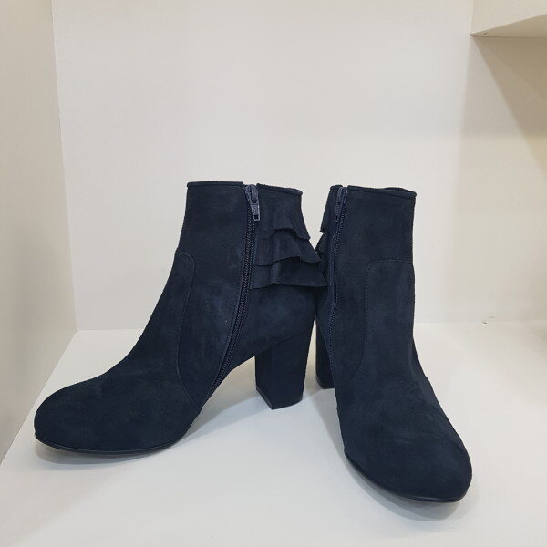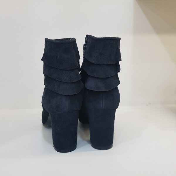 뒷쪽에 캉캉이 프릴디테일이 있는 스웨이드 앵클부츠.