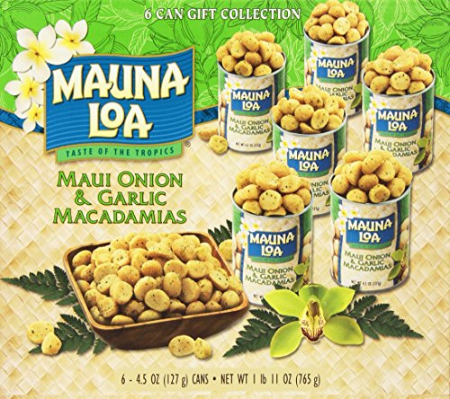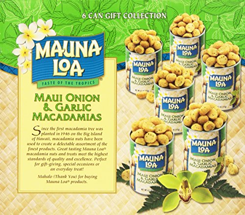 -. Binding : Grocery -. Brand : Mauna Loa -. EAN : 0608939620162 -. Feature : Seasoned with sweet Maui onion and garlic / Great for gatherings and sharing / Taste of Hawaii / Have 2g net carbs per serving -. Label : Mauna Loa -. Manufacturer : Mauna Loa -. NumberOfItems : 6 -. PackageQuantity : 6 -. ProductGroup : Grocery -. ProductTypeName : GROCERY -. Publisher : Mauna Loa -. Studio : Mauna Loa -. Title : Mauna Loa Macadamias, Maui Onion & Garlic, 4.5-Ounce Containers (Pack of 6) -. UPC : 608939620162