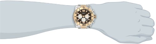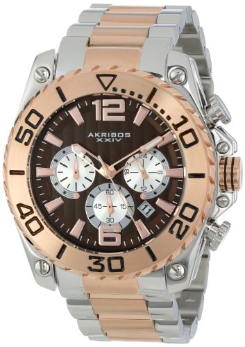 ReleaseDate : 2013-12-05 Studio : Akribos XXIV Publisher : Akribos XXIV Binding : Watch Product Description Stainless steel case with a two-tone (silver and rose gold-tone) stainless steel bracelet. Rose gold-tone bezel. Brown dial with luminous rose gold-tone hands and index hour markers. Arabic numerals mark the 6 and 12 o'clock positions. Minute markers around the outer rim. Dial Type: Analog. Luminescent hands. Date display between 4 and 5 o'clock positions. Chronograph - three sub-dials displaying: 60 second, 60 minute and 24 hour (GMT). Miyota quartz movement. Scratch resistant mineral crystal. Pull / push crown. Screw down case back. Case diameter: 45 mm. Case thickness: 14 mm. Round case shape. Band width: 24 mm. Band length: 9 inches. Fold over clasp with safety release. Water resistant at 10 atm/100 meters/330 feet. Functions: hour, minute, second. Sport watch style. Akribos Conqueror Chronograph Black Dial Two-tone Mens Watch AK639TTR. 0