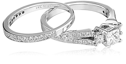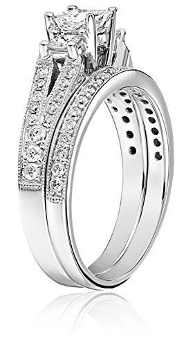 The timeless design of the Kobelli Princess and Round Diamond Wedding Set Rings shows off beauty and class with exquisite style. This diamond wedding set will impress all with the silvery shine of high-polished 14k white gold. The wedding band shows off a single row of brilliant round-cut diamonds. The engagement ring also features an elegant double row of round-cut diamonds on each side of the center settings. The three center stones are princess-cut white diamonds that are simply breathtaking. This ring features a total weight of 1-1/8 carat and measures 4.24 millimeters wide and .25 inch long.Feature