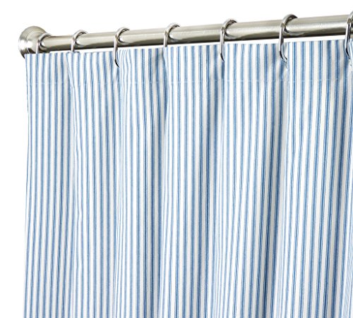 - 100% cotton fabric shower curtain. Washable. Blue and white classic ticking stripe fabric.
