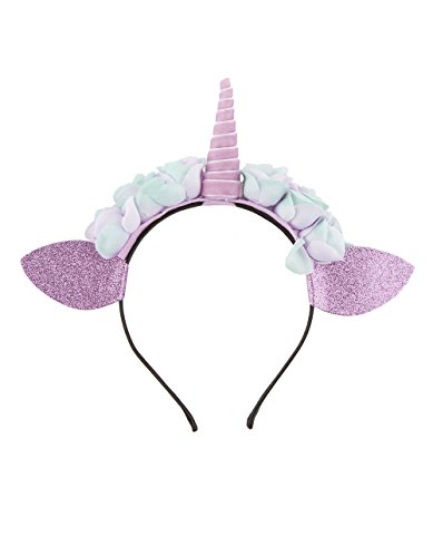 Product DescriptionFlower Unicorn headband. Glitter ears with swirled hue roses. Twisted unicorn horn. Imported.0