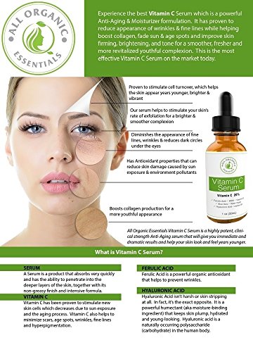 All Organic Essentials Vitamin C Serum 20% is a powerful antioxidant product. This is the best topical Serum on the market. It is also the most effective face serum. The vitamin c benefits include reduction in sunburned cell up to 96% and it prevents the formation of free radicals in sun exposed skin. This face serum helps to fade age spots, sun spots and skin discoloration. It refines your skin texture and reduces the appearance of wrinkles as well as minimizes existing wrinkles which makes your skin appear years younger and more vibrant beautiful skin.