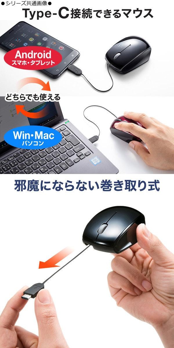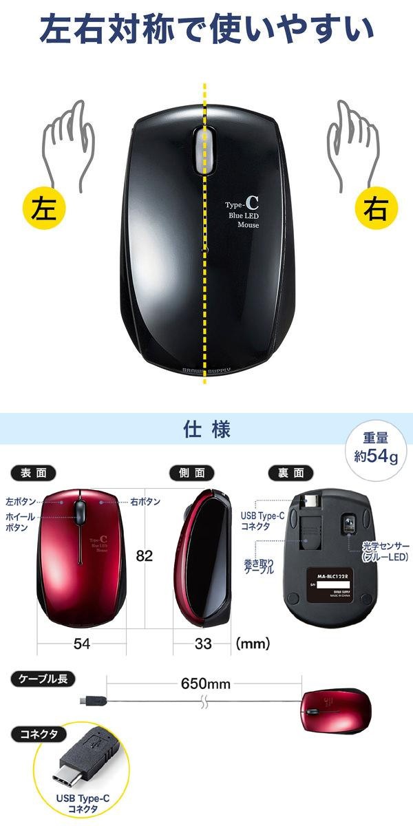 USB Type-Cコネクタを搭載したパソコンやタブレットで使用できる、ケーブル巻き取り式ブルーLEDマウスです。ケーブルを巻き取ってコネクタまで本体に格納できるので、収納がしやすく、ノートパソコンとの持ち運びに便利です。差し込むだけで使える手間なし簡単接続で、面倒なソフトのインストールが不要です。 |