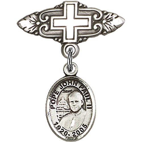 -. Title : Sterling Silver Baby Badge with St. John Paul II Charm and Badge Pin with Cross 1 X 3/4 inches