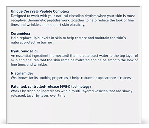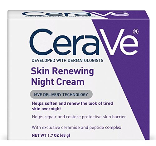 CeraVe Skin Renewing Night Cream is formulated to restore the skin barrier overnight, so you can wake up with skin that looks refreshed and renewed. This nongreasy formula contains an exclusive ceramide and peptide complex, along with kollaren and chronoline to help reduce the look of fine lines and wrinkles and support skin elasticity. Ceramides, hyaluronic acid and niacinamide work to provide intense hydration while helping to repair and restore the protective skin barrier.Feature