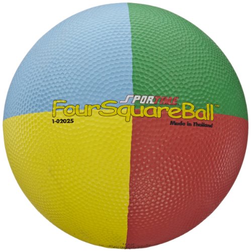 Sportime ball is used to play four square, and has a four-color block pattern for visual appeal and varying the game rules. The ball has a textured surface pattern and soft cover to provide grip and control, and a two-ply 70% butyl rubber bladder for maximum air retention. Rubber is highly elastic, and resists abrasion and impact forces. The ball measures 8-1/2"/21.59cm in diameter.