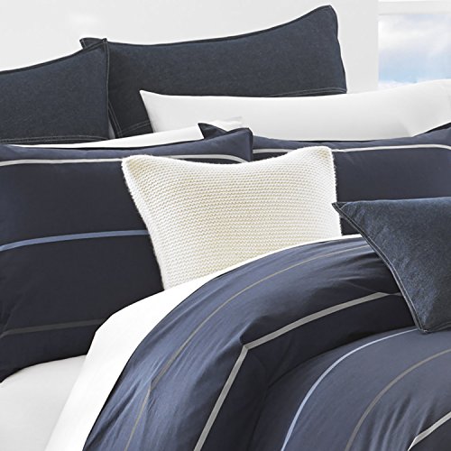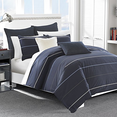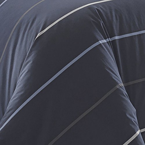Studio : Revman International Publisher : Revman International Binding : Misc. Product Description A deep navy background enhances crisp, clean pinstripes in slate, charcoal, and vintage Blue. The horizontal Orientation of the stripe gives this ensemble a modern sensibility with laid-back style. Beautifully tailored with a signature double needle stitched edge on the bedding and shams, this handsome cotton print will add a fresh note to any bedroom. Bedding is made in Mexico with cotton grown in the USA. 0