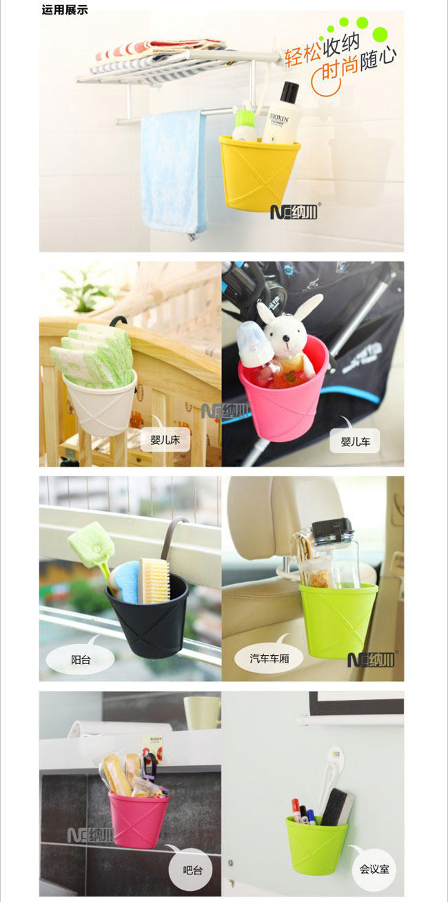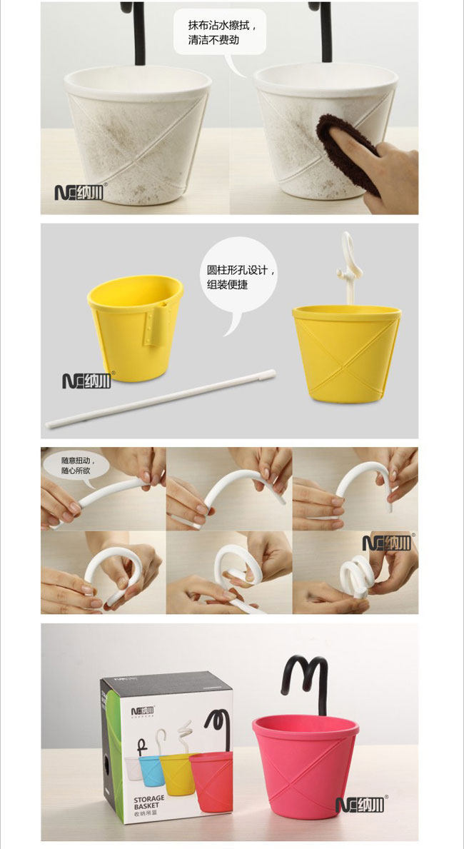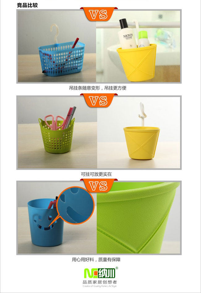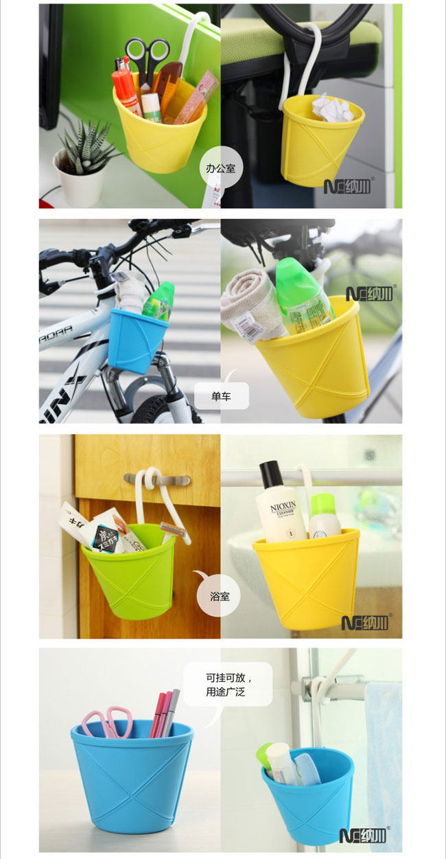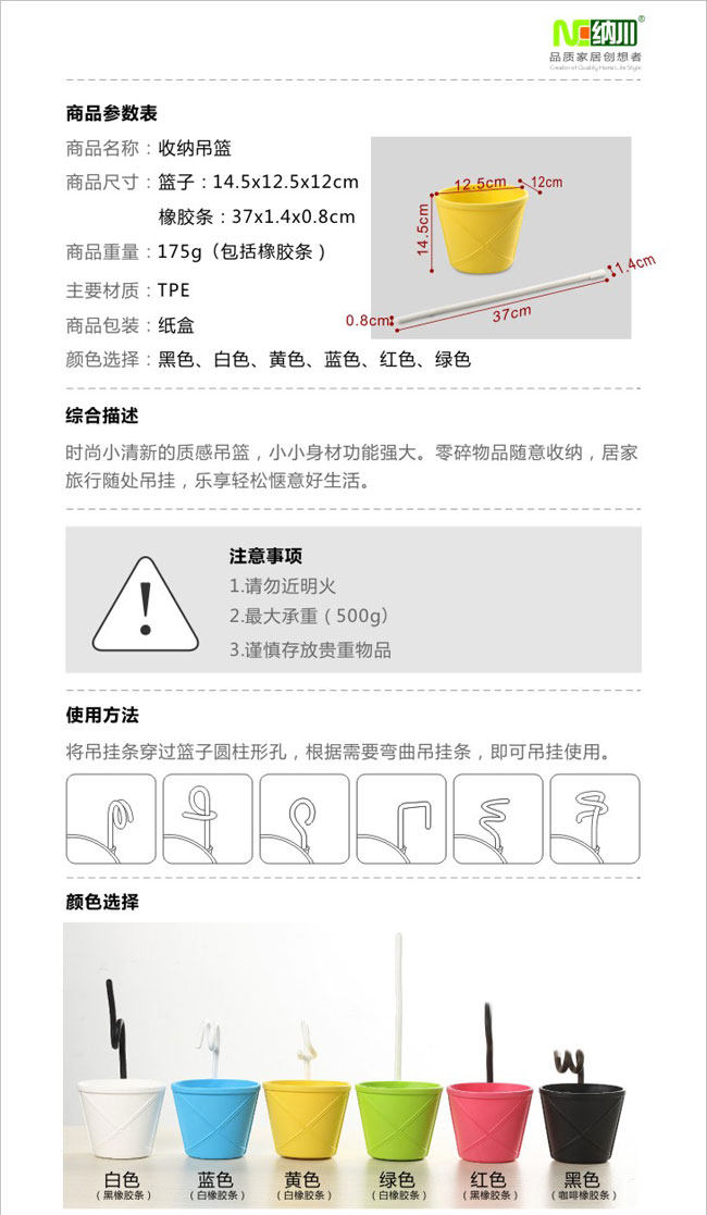 | 商品特点 | 触 感柔软的篮子搭配自由可弯曲的橡胶条形成了独特的收纳吊篮.适用于厨房、客厅、卧室、车厢等使用场所.产品采用橡胶材质制作而成,使墙壁、家具不会因碰撞 而出现划痕,且产品本身耐用、形状恢复性能强.不仅可以收纳各种零碎的小物品,而且还可以随心所欲地吊挂在合适的场所.让我们的小物品存放方便,空间整洁 有序. 【使用方法】: 将橡胶条穿过篮子圆柱形孔,自由弯曲橡胶条,悬挂在合适的场所 |
