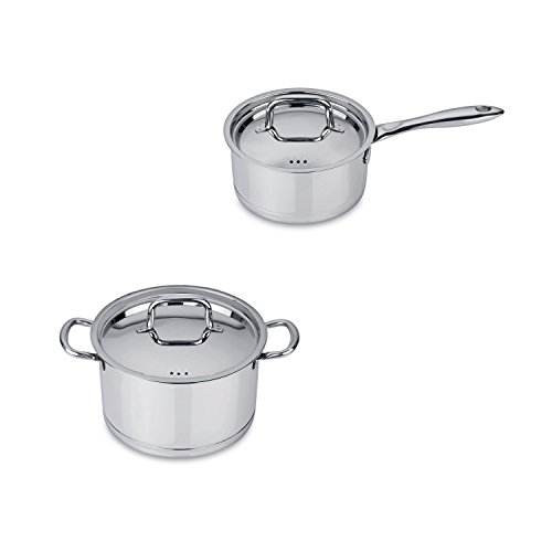 - Set includes: 9.5" covered stockpot with glass lid, 6.25" covered saucepan with glass lid. Classic and stylish combo.