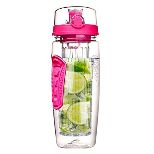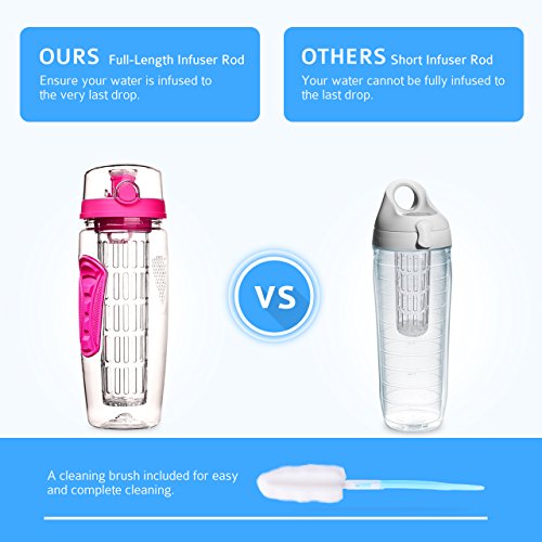 Features of Our Fruit Infuser Water Bottle 1.A large water capacity of 32oz 2.Toxin-free, shatter-resistant and impact-resistant Tritan copolyester 3.Full-length removable infuser rod 4.Leak-proof design 5.Dual anti-slip grips auto align lid 6.Convenient thumb releasing button 7.A metal latching loop a carrying loop