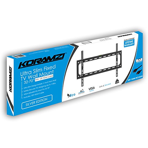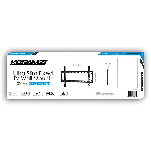 -. Binding : Electronics -. Brand : Koramzi -. Color : Black -. EAN : 0785339977499 -. Feature : Ultra Slim and Super Low Profile (less than 1") Designed Fixed TV Bracket / 600X400 VESA Size Fits Most 32" to 70" TV's and Can Hold up to 110 lb / Includes 3-Axis Bubble Level and 10 ft. HDMI Cable for FREE / Backed up with Lifetime Warranty Against Any Defect / Powder coated black finish for durability -. Label : KORAMZI -. Manufacturer : KORAMZI -. Model : KWM988F -. MPN : KWM988F -. NumberOfItems : 1 -. PackageQuantity : 1 -. PartNumber : KWM988F -. ProductGroup : Home Theater -. ProductTypeName : AV_FURNITURE -. Publisher : KORAMZI -. Size : 25in x 8.8in x 1in -. Studio : KORAMZI -. Title : Koramzi Fixed TV Wall Mount Bracket Fits 32-70" TV's 600x400 VESA Low Profile Ultra Slim including Bubble Level & 10ft. HDMI Cable Life Time Warranty-(Black)- KWM988F -. UPC : 785339977499