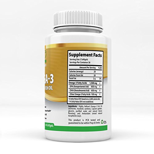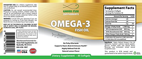 Natural Fish Oil Supplement. Burpless, Natural Lemon Flavor. Beef-gelatin, Non-GMO, LIMITED SALE, Made in USA.| 1500mg of total omega 3 | 800 mg EPA, 600 mg DHA. Great Omega 3 strength. 60 Softgels.