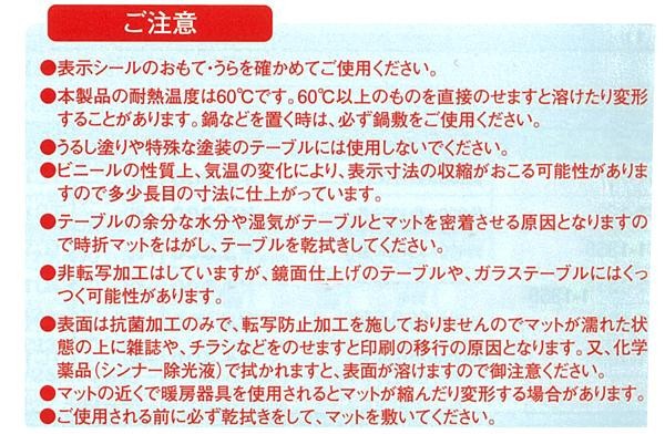 | 仕様 | 表面:抗菌加工 裏面:非転写加工 四つ角R:10mm 厚み:2mm 耐熱温度:60度 |