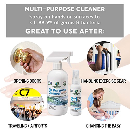 -. Feature : 2-PACK BUNDLE DEAL INCLUDES (1)16oz Bottle and (1) 2oz Bottle of USDA Organic - Sanitizer, Surface Cleaner, and Hand Sanitizer. Quick Drying with no sticky residues, Effectively kills 99.9% of germs & bacteria / Hand Sanitizer Spray - 100% Chemical Free & Alcohol Free, No Rinsing Required, Leaves all surfaces germ free and skin soft without drying it out - 360 Degree Pump sprayer - Pleasant Orange Fragrance unlike the alcohol smell left by competitors / All Purpose Cleaner - Ultra Portable for Travel, Car, House, Kitchen, Bathrooms, Baby Changing Tables, Booster Seats, Counters, Windows, Stainless Steel Appliances, Cell Phones, Smartphones, Toilet Seats, Paint, Mirrors, Electronics, Hands, Skin / Natural Cleaners - Natural household cleaners are made from organic essential oils and are safe for kids, children, pets, and your whole family / 100% SATISFACTION GUARANTEED - Safe for Kids, Children, Pets, Family All Household Surfaces, Certified USDA Organic, Natural, non-toxic, hypoallergenic, vegan, biodegradable, Cruelty-Free - Never Tested on Animals, Made in the USA, Made with the highest quality essential oils and natural ingredients