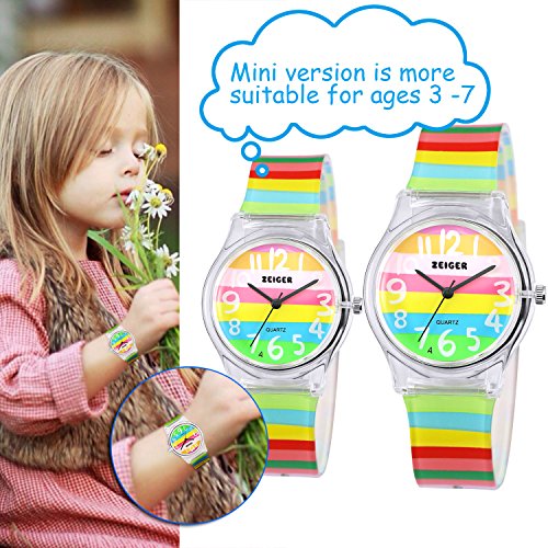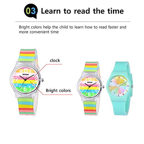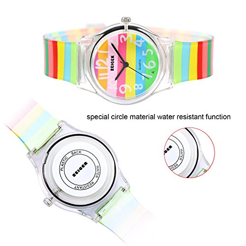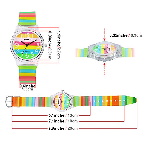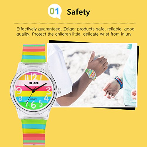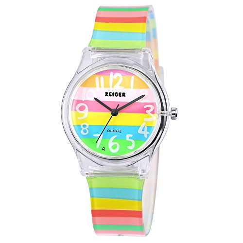 kids new cool watch - Quartz movement, Casual watch, White hands and numbers,Resin bezel, Resin case, crown and caseback, 30 meters/99 feet water resistant The Kids'easy read Watch by zeiger is the perfect starter watch for your child. Its sturdy high-grade White silicion children's-length band attaches with easy-to-fasten Buckle. Featuring analog-quartz movement and stationary bezel around the handsome, round resin case, the watch has color dial with numerals, white hour, minute, and second hand . It's Water resistant to 30 m (99 ft): In general, withstands splashes or brief immersion in water, but not suitable for swimming. Kids favorite color rainbowFeature