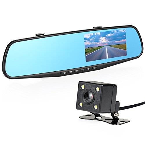 -. Feature : Perfect Dual Lens Integration:With our Dual Lens Car Camcorder,your car will have camera with a front lens and a waterproof rearview lens,4.3 inch rearview anti-dazzling mirror.With one button, you can switch quickly between front view, rear view and picture-in-picture display. / Loop Recording Function: This function ensures continuous recording without missing a second,record automatically during vehicle ignition, switch off automatically with ignition off to get you free from the hands operation. / G-Sensor Function:You can choose the sensitivity freely,when you have an emergency brake, the car camera will automatically save and lock this video.The locked video may help to avoid unnecessary traffic matters. / Parking Guard: When you leave you car and turn on this function,the camera will start up to record and lock the file to save as evidence when your car is shocked by external force collision. / More Features:For better using experience, one more USB port is built in the car charger so that the phone can be also charged when camera is recording. Other features like motion detection, reversing visual function,time setup,and microphone/speaker are also available .All these functions can let you enjoy you car driving on the way safely and comfortably.