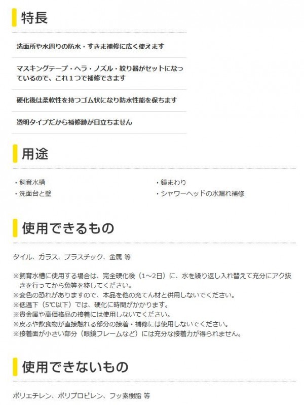 | 仕様 | 色調:透明(半透明) 約3.6m使用可(目地幅5mm×深さ5mmの場合) 有効期限:製造後18ヶ月(製造年月日はパッケージ台紙下部記載) |