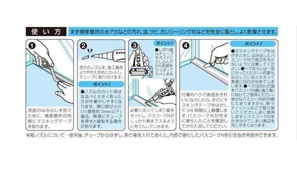 | 「バスコークN」はマスキングテープ・ヘラ・しぼり器がセットになったオールインワンパッケージ。必要なアイテムがすべてそろっているので、買ったらすぐに張り替え作業ができます。業者さんにシリコーンゴムの張り替えを頼むよりも経済的です。 |