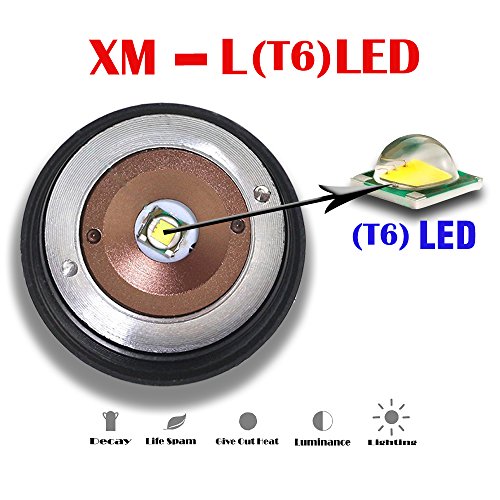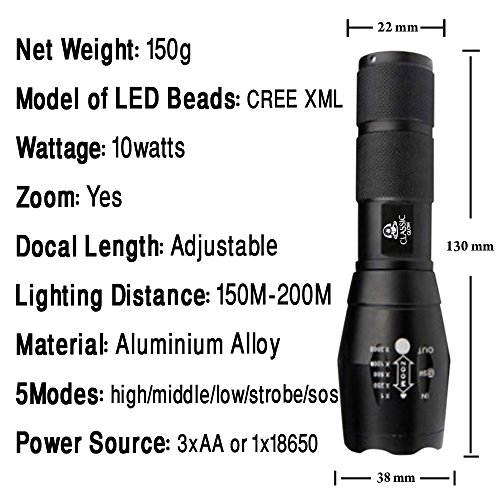-. Feature : Led Flashlight CREE XML T6 Good quality product factory, quality assurance / Adjustable focus range for different usage, stretching to adjust its focus / 5 switch modes: high / medium / low / strobe / SOS / Skid-proof and water resistant design, best suitable for Outdoor Camping, Climbing, Cycling, etc / Power Source: 1 x 3.7V 18650 Battery(Included) or 3x AAA battery (Not Included)