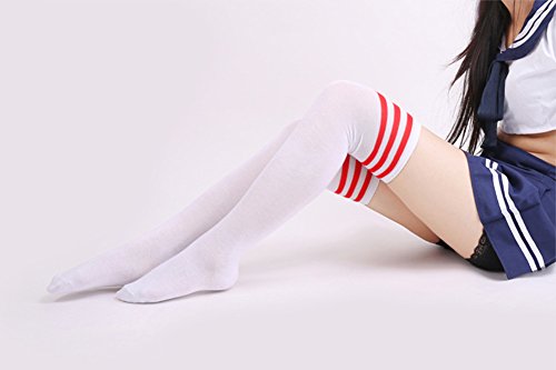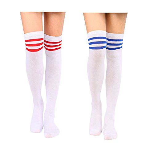 -. Feature : Made from soft and comfortable poly-cotton blends,breathable and comfortable. / Free size,one size fits most women and girls,they have good elasticity and will not fall down / For the season:SP.R.Ing,Summer,Autumn,Winter,almost all the year round. / Match dresses,skirts,shorts,sports suits,cosplay,parties,team casual team sports,daily college school days,etc. / Include:2 Pairs striped knee high socks
