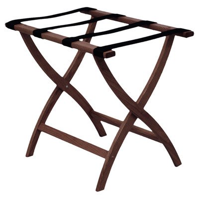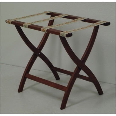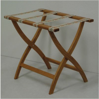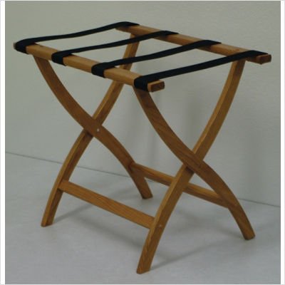 Studio : Wooden Mallet Publisher : Wooden Mallet Product Description Do you love the convenience of a luggage rack, but wish they could be a little more decorative?? Then you'll absolutely love this Luggage Rack with Tapestry Webbing.? Built using solid oak and featuring sturdy tapestry webbing, even the heaviest suitcases are easily supported by the four two-inch wide woven straps.?? Graceful, curved legs add a designer flair.? This luggage rack has multiple uses when it doubles as a breakfast tray holder or blanket stand.? These luggage racks fold and unfold easily.? Take it out for guests, then fold for easy storage.? The Rack is also a great in the master bedroom for packing suitcases for business trips or vacations.?? tab.? Order the Designer Solid Oak Luggage Rack with Tapestry Webbing CURVED X in Medium Oak/Tapestry today, and bring a measure of design and class to your travels.? Assembly level/degree of difficulty: No Assembly Required. Made in America 0