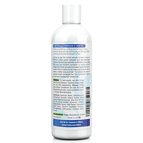 Best Anti Dandruff Hair Conditioner Puriya Scalp Therapy contains a therapeutic mixture of arnica, rosemary, sage, tea tree oil and wheat protein for powerful relief from scalp itchiness and flaking. Scalp Therapy is fast-acting: the antifungal and antibacterial properties inherent in the natural ingredients provide quick relief from an itchy scalp. But you expect more out of your shampoo and conditioner, and Puriya Scalp Therapy delivers! Enjoy clean, shiny, voluminous and healthy hair while simultaneously addressing the health and comfort of your scalp. Scalp Therapy Conditioner is packed with essential oils and Vitamin B to repair and strengthen damaged hair, moisturize dry hair and create enviable volume and shine.? New hair growth will also be healthier, stronger, thicker and shinier thanks to the stimulating effects of Scalp Therapy, which not only increases circulation in the scalp, but also provides nutrients and moisture in a deeply penetrating formula.? Puriya Scalp Therapy is safe for use on colored hair and all hair types. It has a balanced pH and contains no artificial fragrances, paraben, sodium chloride or sulfate.? 180-Day Money Back Guarantee! If you don’t love Scalp Therapy and feel it has relieved your dry, itchy and flaky scalp, simply contact us within 180 days of purchase for a full refund, no questions asked.? Order Today. ?Risk Free.? Place your order today! ?You have everything to gain by trying Puriya Scalp Therapy completely risk-free. ?You are only a click away from a healthy scalp and beautiful hair. 0