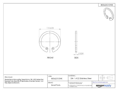 Standard Internal Retaining Ring, Tapered Section, DIN 1.4122 Stainless Steel, Passivated Finish, Meets DIN 472 Specifications, 15mm Bore Diameter, 1mm Thick, Made in US (Pack of 5)
