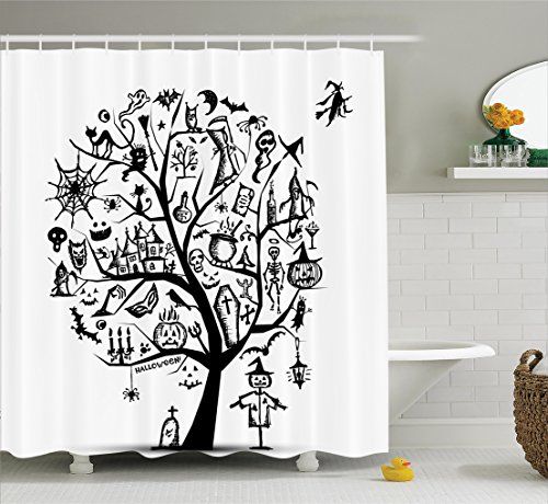 Halloween Decorations Shower Curtain Set By Ambesonne, Sketch Style Halloween Tree With Spooky Decor Objects And Wicked Witch On Broom, Bathroom Accessories, 69W X 70L Inches, Black White