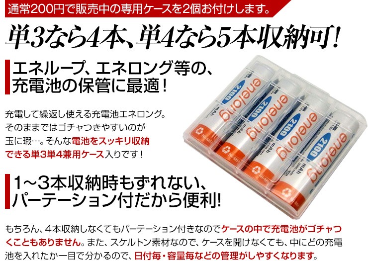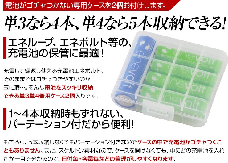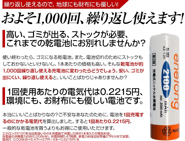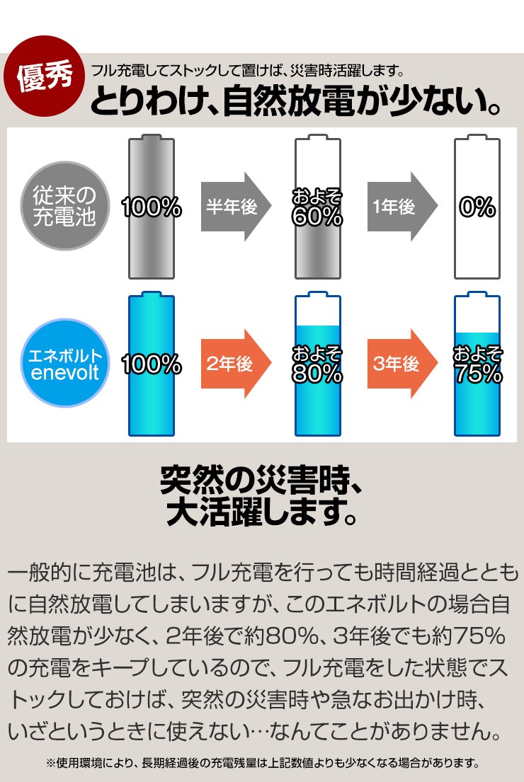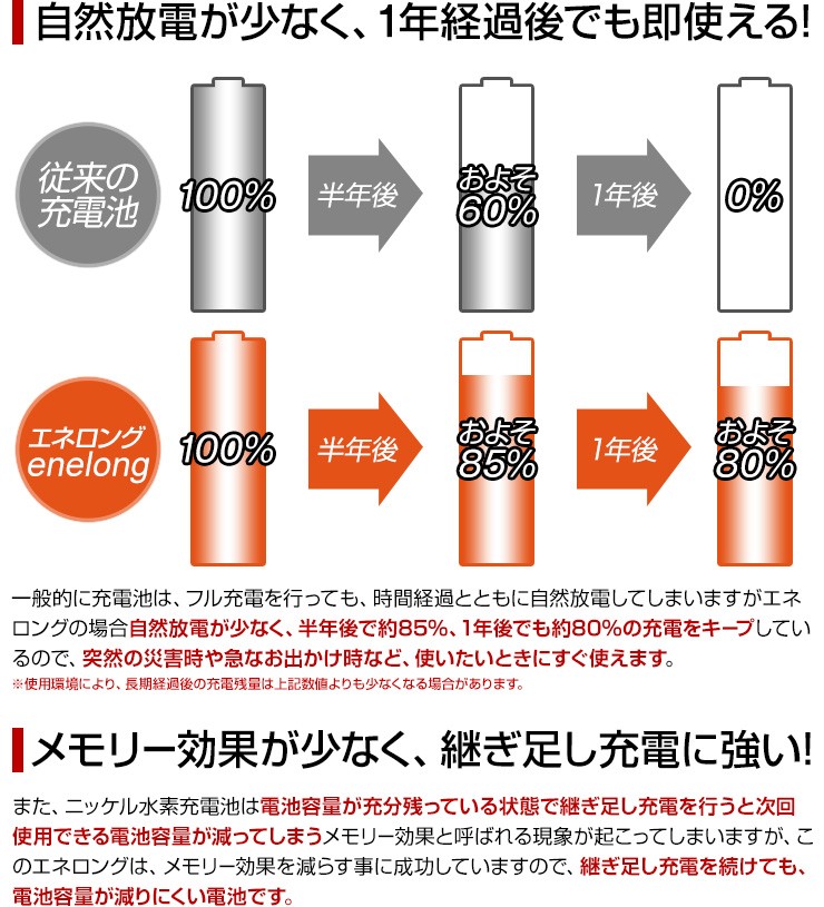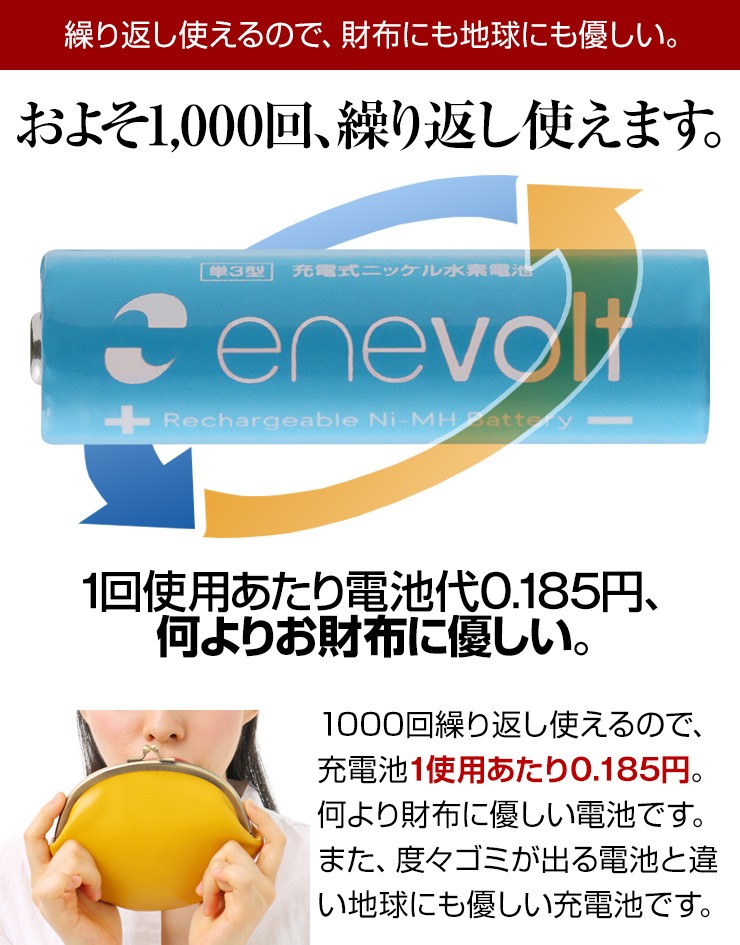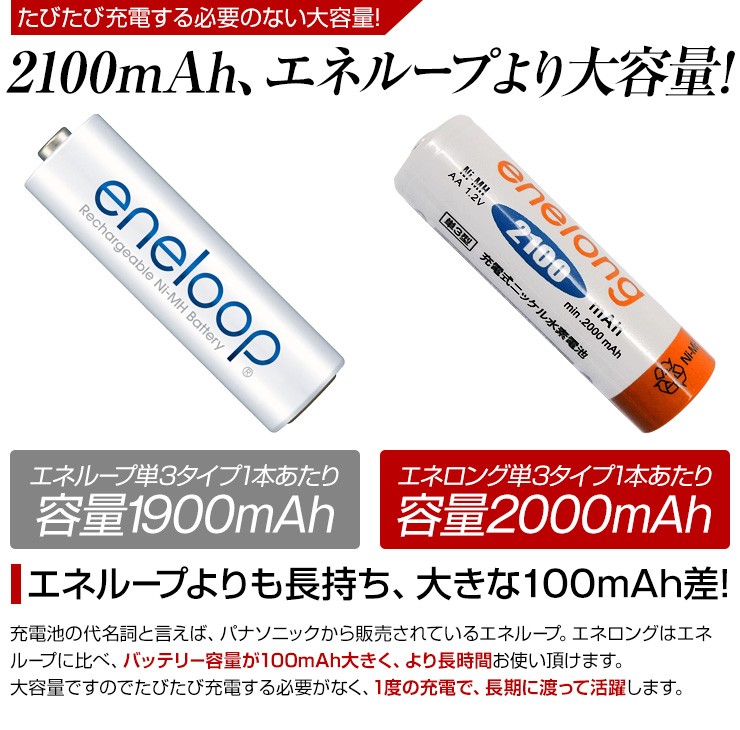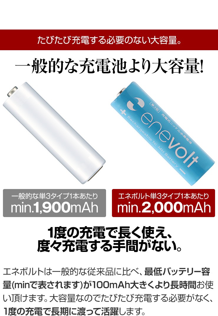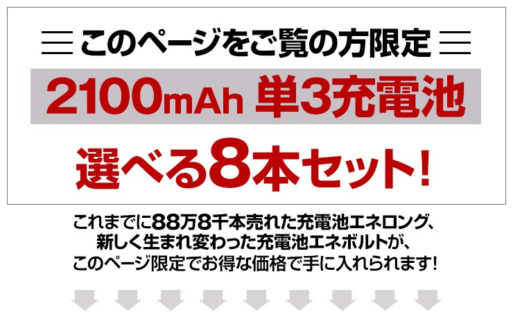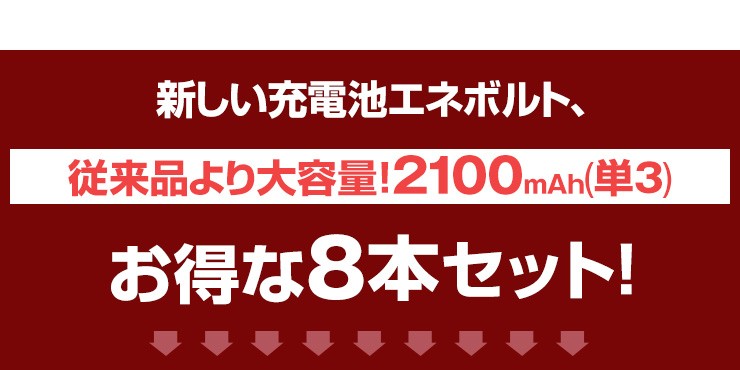 累計88万8千本売れた充電池エネロング、新しく生まれ変わった充電池エネボルトのお得な8本セット、いずれかお好きなほうをお選びいただけます!【エネボルト特徴】●強さ長持ち大容量●1000回繰り返し充電して使えるので、お財布にも地球にも優しい。●自然放電量が少なく、フル充電から3年を経過しても、75%の容量が残っています。●メモリー効果が少なく、継ぎ足し充電に強い。●180日保証だから安心。●充電は、当社enevolt対応の充電器を使用して下さい。●外装ラベルを剥がしたり、傷をつけない。●新旧の電池や充電した電池と放電した電池の混用をしない。●強い衝撃を与えたり、投げつけない。【エネロングの特徴】●充電してくり返し約1000回使える!●充電しておけば1年後でも約80%のエネルギーが残存!●メモリー効果が少なく、継ぎ足し充電にも強い!デジキン