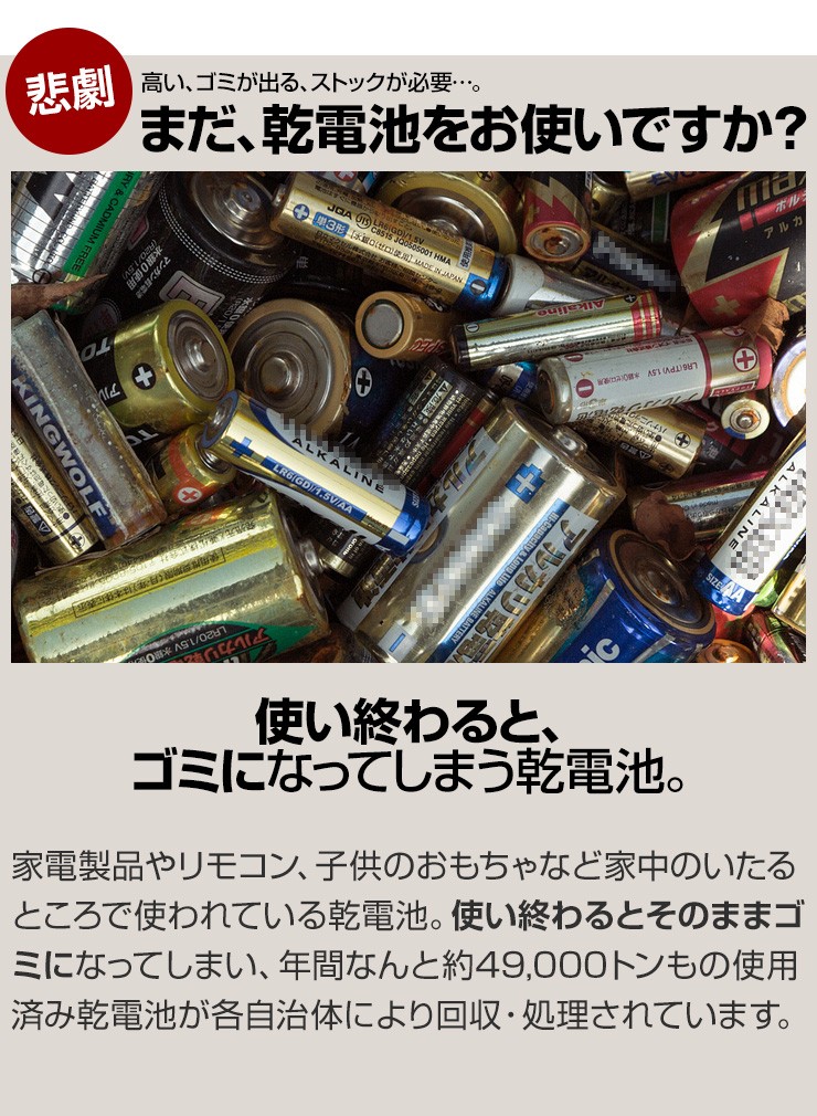 ※アルカリ乾電池と比較し、若干大き目サイズです。(乾電池規格内です。)電池切れになった電池を残量ゼロのまま放置すると、充電・使用できなくなる事があります。必ず1度フル充電状態にしてから保存して下さい。