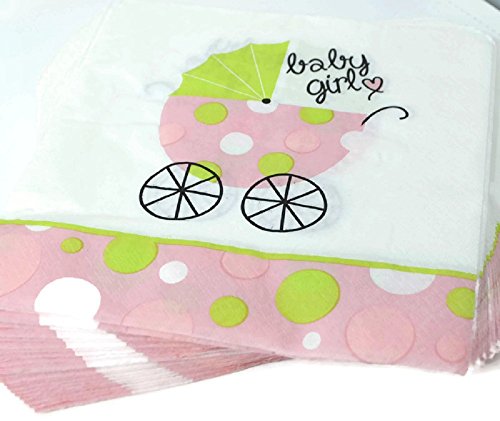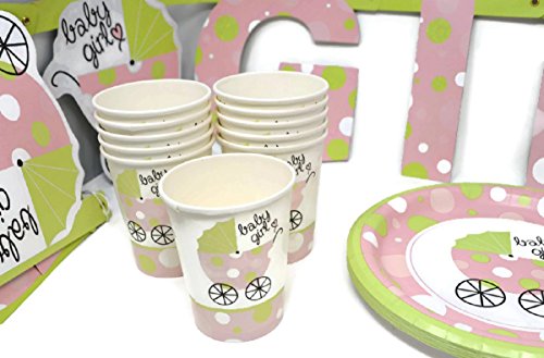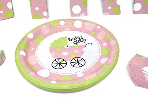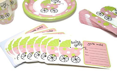 EVERYTHING YOU NEED FOR A BABY SHOWER - Ten Pink and Green" Baby Buggy" Shower Invitations, Eight 8.75" Party Plates,Twenty Napkins,Twelve 9 oz Beverage Cups and BONUS Matching "Baby Shower" Banner.