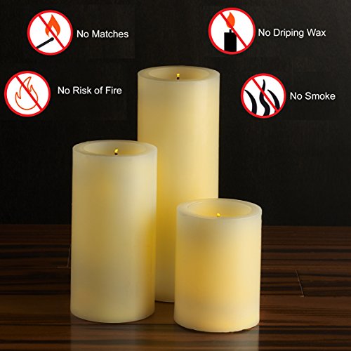 - Features a 2, 4, 6, or 8-hour-hour daily timer, automatically turns on same time the following day and easy ON/OFF switch located on the bottom of each candle; remote included