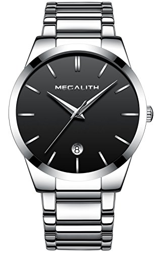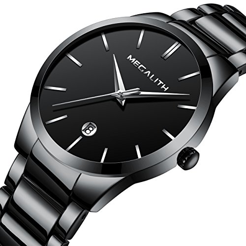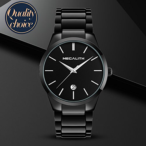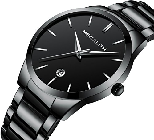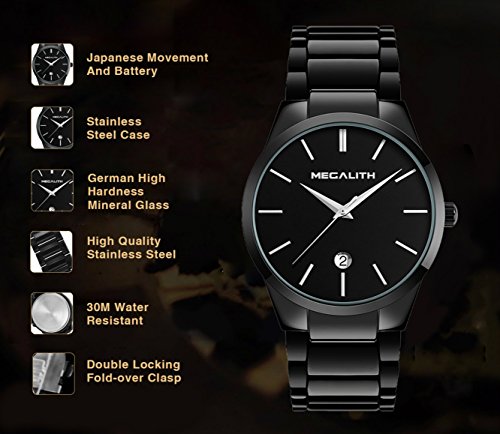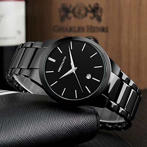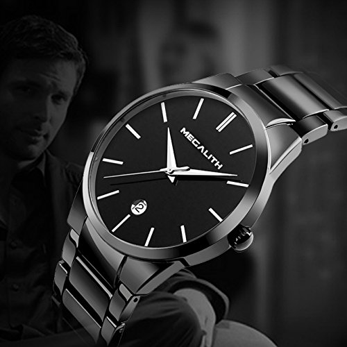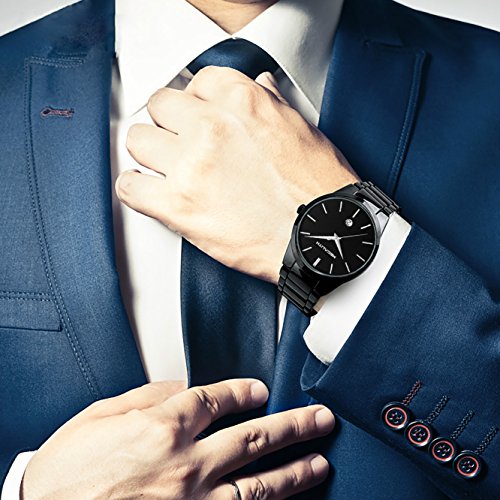 -. Feature : DURABLE and COMFORTABLE: Japan quartz movement and battery provide accurate time keeping and a service life of more than 3 years, certainly the battery is also easy to be replaced. Suitable watch weight, luxury black stainless steel watch band and smooth steel band surface, all these let this watch super elegant and comfortable to wear. What's more, a free link remover is provided with this watch, so you can adjust the band length at home by yourself after reading instruction / Unique and Elegant DESIGN: Simple and luxury Black Dial with Calendar, Thick and Comfortable Black Stainless Steel Watch Band; High hardness mineral glass watch face; IP Black plating watch case and watch band will never fade; Case diameter: 40mm; Band Width: 20mm; Case Thickness: 11mm; Band Length: Men's Standard. Luxury design and comfortable wearing experience, this is a perfect travel and business casual watch for you / PAIR WITH ANY OUTFIT and OCCASION: Ultra quiet and low maintenance, and with simple, luxury and classical appearance. Casual enough for every day wear but also looks great with business attire. This wrist watch will go great with any outfit and any occasion. It enables you to easily spice up a normal outfit and add style to your life / PERFECT GIFT BOX WITH BONUS: This watch is well packaged in a stylish and luxurious beige paper watch box. What's more, we also provide a free microfiber of high quality for cleaning your watch case, glasses, or other things you need it for. Unlike other seller's cheap and flimsy package, this wrist watch will be a perfect gift for yourself or for that special someone / PURCHASE WITHOUT WORRY: Each watch comes with a 24-month warranty and 90-day 100% money back full refund guarantee. We care about our customers, If you have any dissatisfaction, please send message to us on Amazon, we will do our best to make it right! Click the Add to Cart button now to ensure you receive the best casual business stainless steel watch on Amazon